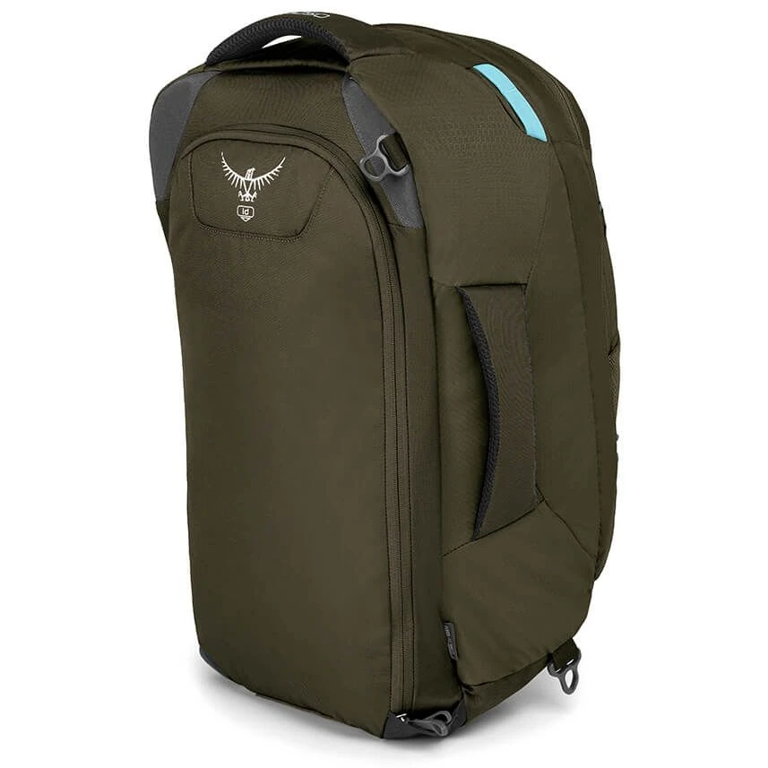 With padded top and side handles and a removable shoulder strap, this women’s backpack is easy to lift off the strap at the airport and carry with ease. The large, lockable zippered opening gives you easy access to the main compartment. The compression straps keep everything in place inside and ensure that you can make maximum use of the space. There’s also a pocket for your phone or sunglasses, two mesh pockets for water bottles and a padded laptop compartment.