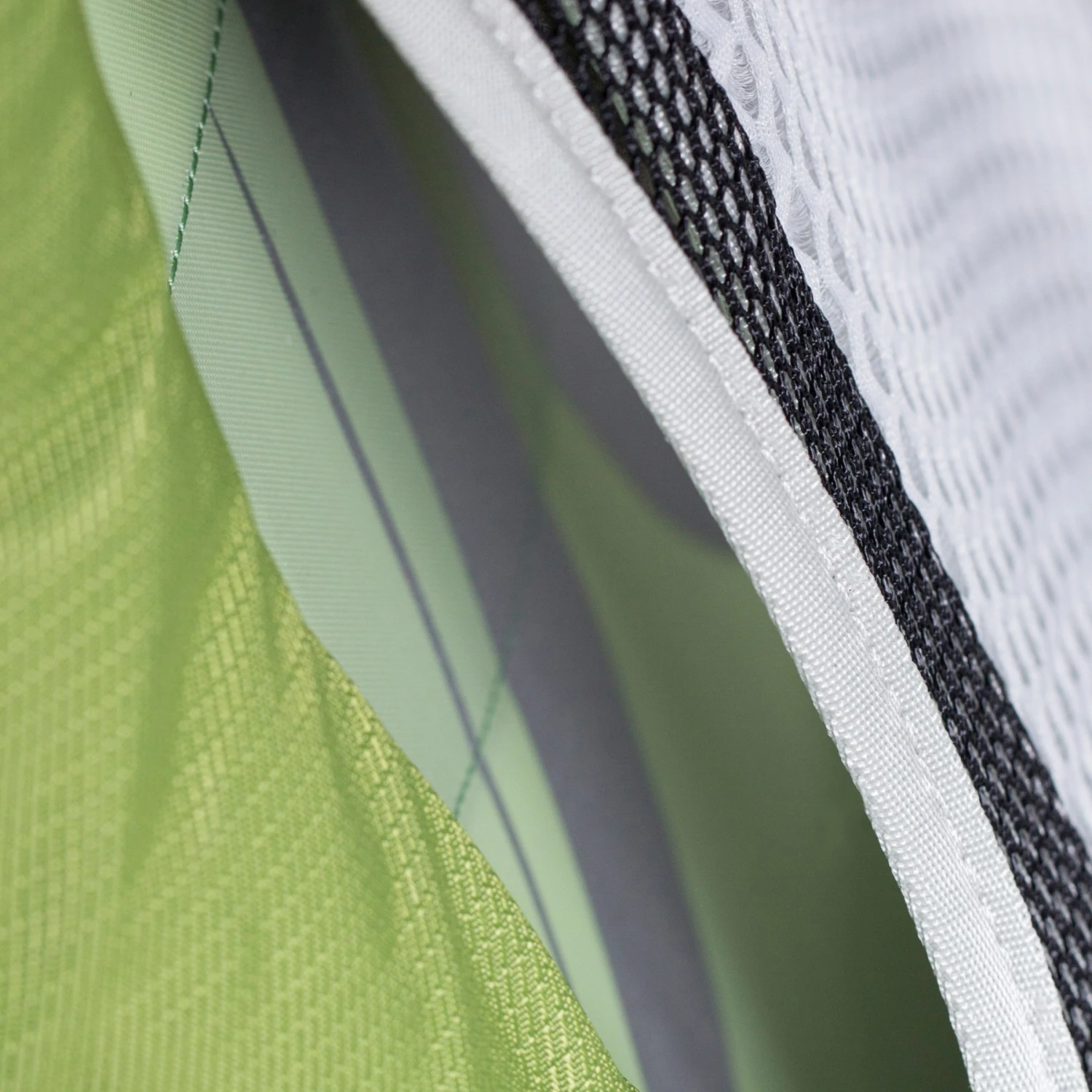 Injection molded back system with 3D stretch mesh for breathable comfort.